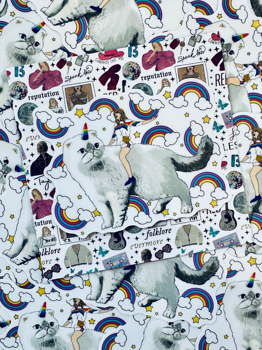 #caticorn commercial, Riding Rainbow Unicorn Horn Cat Through Forest Sticker