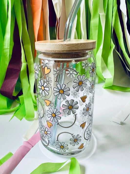 Daisy Smiley Face Glass Coffee Cup, Nature, Plant Mom, Floral Inspired Tumbler, Daisy Eyes Glass Beer Can, Cold Coffee Cup