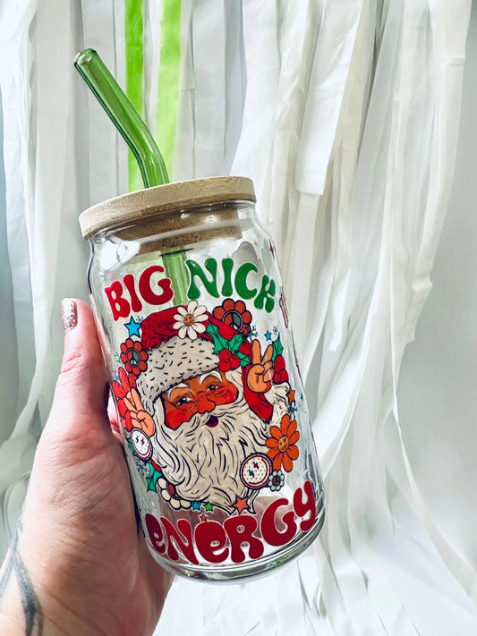Big Nick Energy, St. Nick/Santa Inspired, Christmas & Holiday Cold Glass Beer Can with Lid & Straw