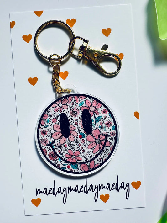 Retro Happy Flowers Smiley Keychain, Distressed Floral Smiley Acrylic Keychain, Dainty Keychain Aesthetic, Trendy Obsessed Girly Keychain