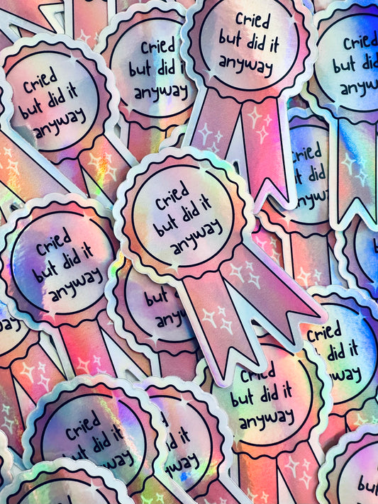 Cried but did it Anyway Ribbon Sticker, Mental Health Award, Holographic Sticker